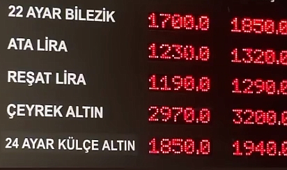 22 Kasım Çarşamba günü itibariyle altın fiyatları ise şu şekilde oldu; 22 ayar bilezik bin 850 TL, Ata lira 13 bin 300 TL, Reşat lira 12 bin 900 TL, çeyrek altın 3 bin 200 TL, 24 ayar külçe altın bin 940 TL.