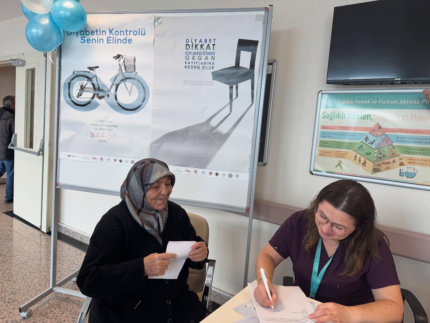 Hastane giriş alanında kurulan diyabet bilgilendirme standında ziyaretçilere diyabetin belirtileri, korunma yöntemleri ve düzenli ölçümün önemi anlatıldı. Standa gelen vatandaşlara: