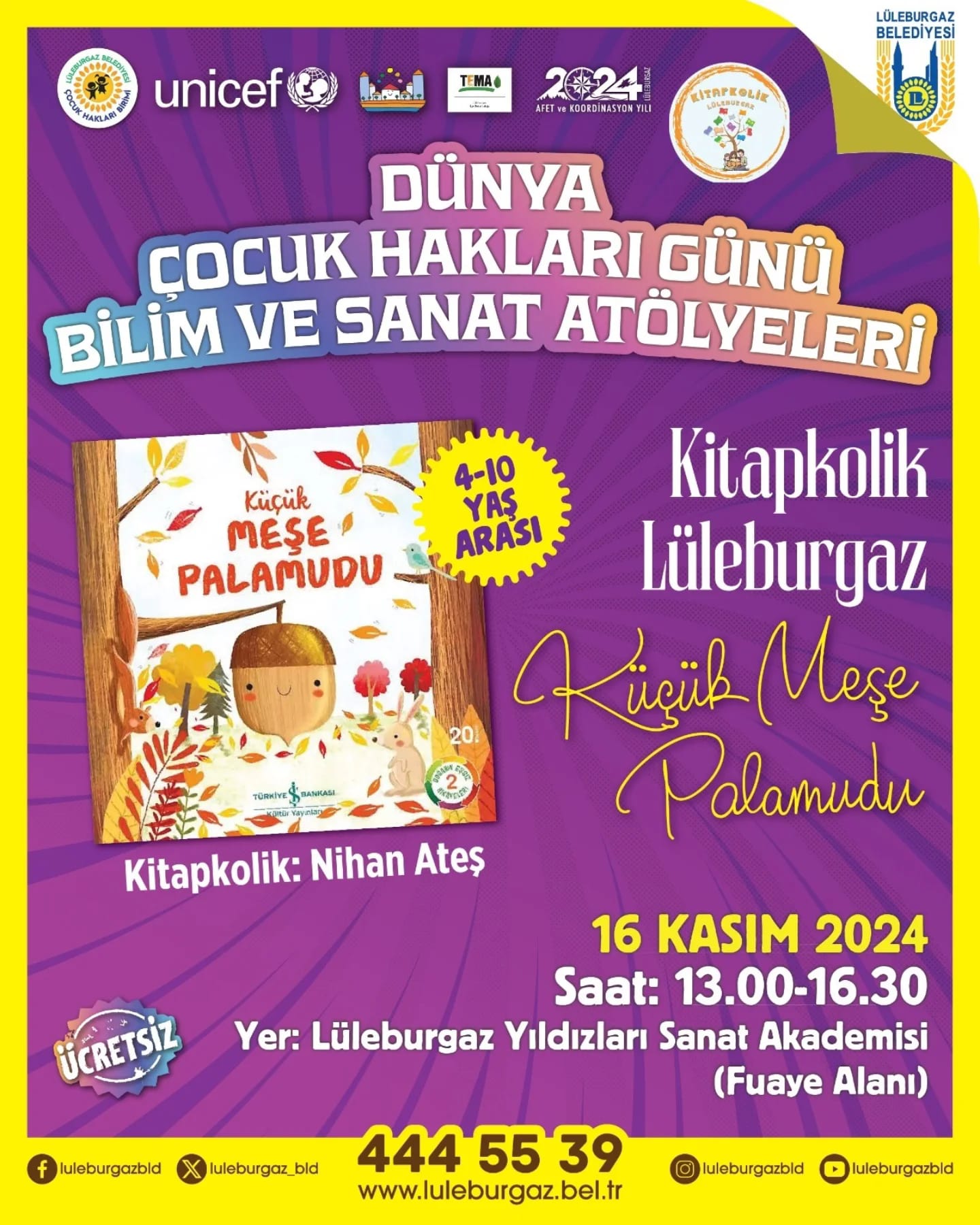 15 Kasım’da ise çocuklar "Yetenek Sirkiniz" etkinliğiyle yeteneklerini sergileme şansı bulacak. Bu etkinlik, çocukların kendilerini ifade etmeleri, farklı yeteneklerini keşfetmeleri ve özgüvenlerini artırmaları için harika bir fırsat olacak. 16 Kasım’da ise iki farklı etkinlik bir arada düzenlenecek; "Alice Müzikali" ile çocuklar tiyatro dünyasına adım atarken, aynı gün "Küçük Meşe Palamudu" atölyesi ile doğanın harikaları keşfedilecek.