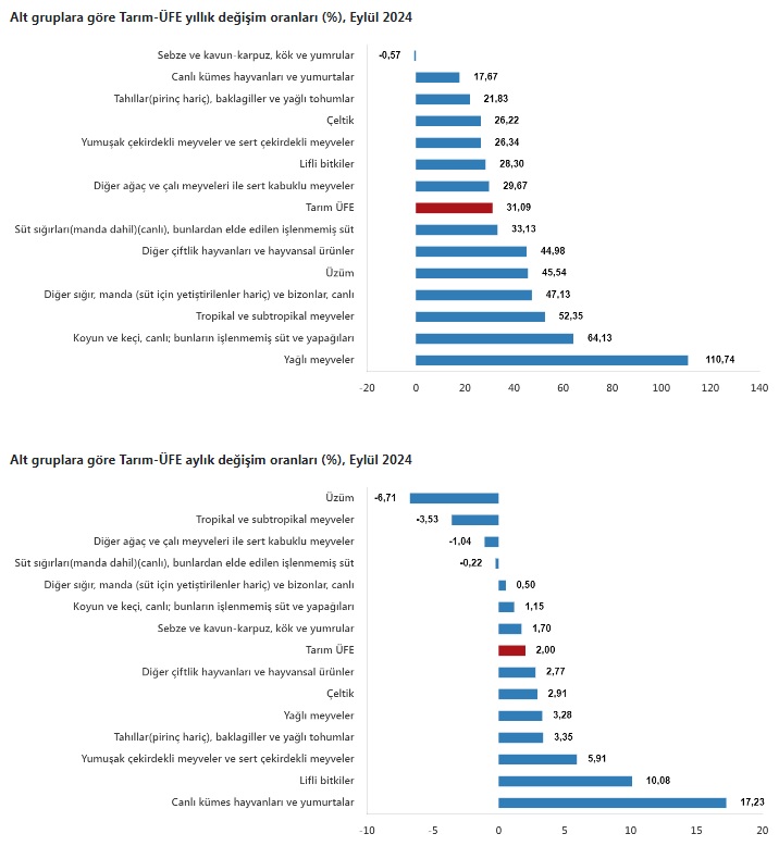 Türkiye İstatistik Kurumu (TÜİK) verilerine göre, Tarım Ürünleri Üretici Fiyat Endeksi'nde (Tarım-ÜFE) 2024 yılı Eylül ayında önemli artışlar kaydedildi. 2020=100 baz yılına göre hesaplanan endekste, bir önceki aya göre %2,00, bir önceki yılın Aralık ayına göre %20,28, geçen yılın aynı ayına göre %31,09 ve on iki aylık ortalamalara göre %52,28 oranında artış yaşandı.