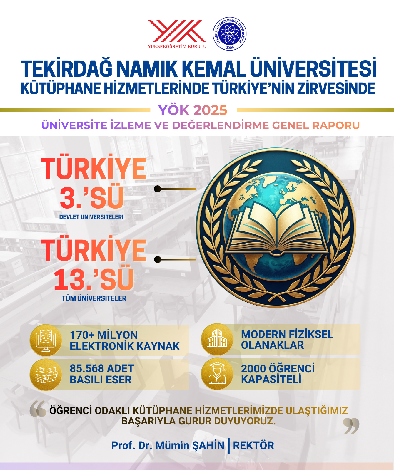 Elde edilen başarıyla ilgili değerlendirmelerde bulunan Rektör Prof. Dr. Mümin Şahin, “Öğrenci odaklı kütüphane hizmetlerimizde ulaştığımız %77,23'lük memnuniyet oranı, üniversitemizin ulusal düzeydeki yükselen grafiğini ve kalite standartlarını bir kez daha tescillemiştir. Hedefimiz, eğitim ve araştırma altyapımızı dünya standartlarına taşıyarak öğrencilerimize en iyi deneyimi sunmaya devam etmektir” dedi.