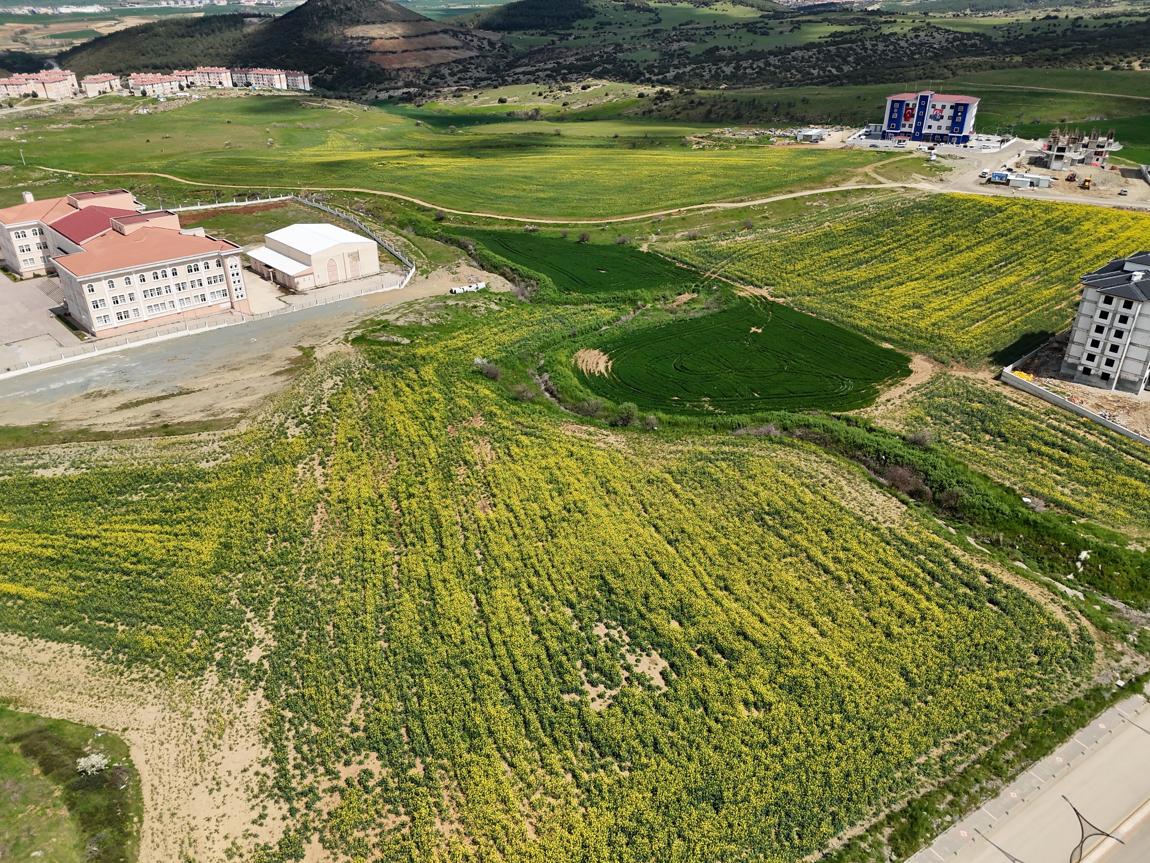 Sarı renge bürünen kanola tarlaları havadan da görüntülendi.