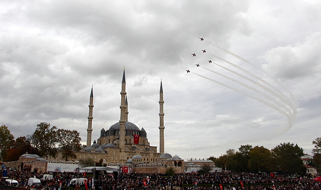 TÜRK Hava Kuvvetleri’nin Türk Yıldızları akrotim ekibi, 29 Ekim Cumhuriyet Bayramı’nın 102’nci yıl dönümü kutlamaları kapsamında Edirne’de gösteri uçuşu yaptı. Selimiye Camisi meydanında toplanan vatandaşlar heyecanla dolu anlara şahitlik ederken, pilotların gösterileri nefes kesti.
